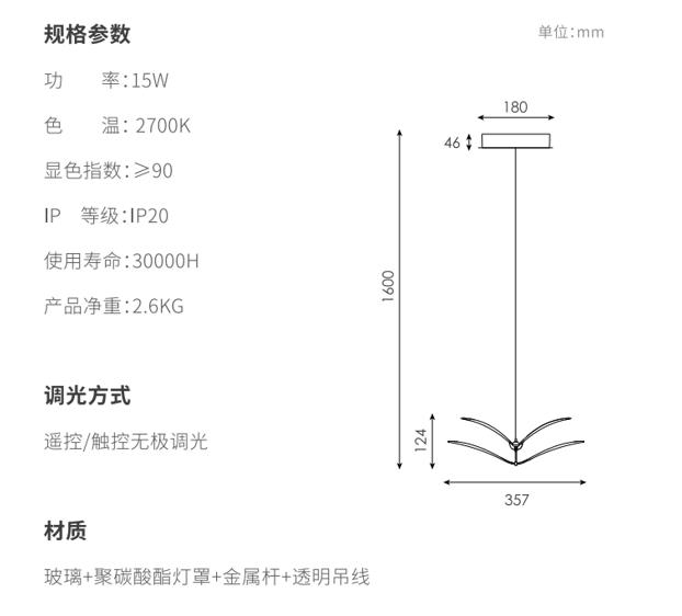 如翼吊灯用双层弯曲的造型作为主要造型特征形成在空间里自由灵动的造型,,以一定的角度倾斜,,,形成丰富的画面,,,,两翼的线条均为精心设计,,,精准控制光线的传播,,,将直下光和漫反射光结合,,70%灯光向下,,,30%灯光向上,,,,在空间里形成舒适的光学效果,,,下灯罩为片状玻璃印刷专门调制的乳白色油墨,,热弯成对应弧度,,灯光透过灯罩呈现出更加柔和的视觉效果;边缘特意留有5mm宽度透明环,,,,使视觉更精致轻巧;灯罩利用两个金属“领夹”式的杆连接固定,,整体视觉优雅;