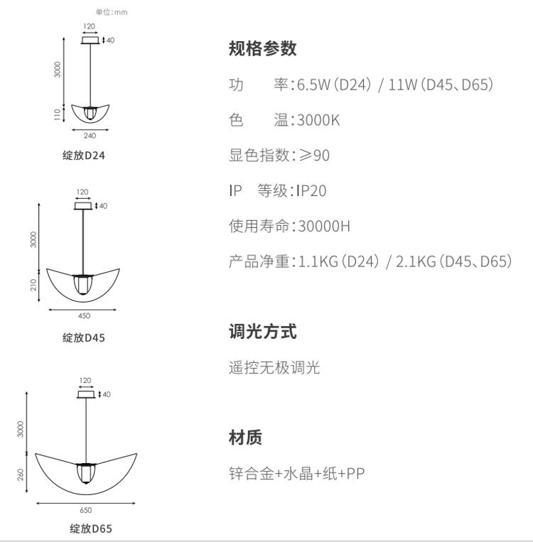 利用材料物理弹性,,透过巧妙的结构,,,灯罩在空间里呈现一个富有张力和生机的曲面,,,仿佛在空间里热烈绽放的花朵,,,灯罩表面采用手工敷纸工艺,,更加的朦胧舒适,,纸纤维的材质也让灯光更加温柔。。。。选用实心高级无铅水晶材质,,,这种材料洁净无瑕的透明度与低色散特性,,,,硬度高,,,,多用于精密光学器件及高端水晶制品,,更好展现丰富光影质感。。。