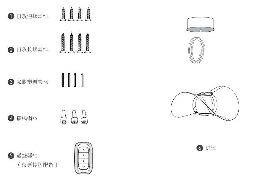 自攻短螺丝*4;自攻长螺丝*4;膨胀塑料管*4;接线帽*4 遥控器*1(遥控版本);灯体*1;